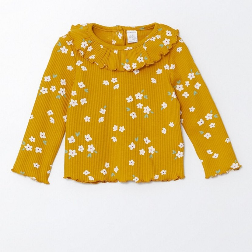 Sarı, uzun kollu, fırfırlı yakalı ve çiçek desenli,