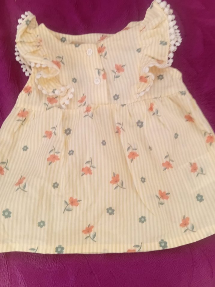 Kolsuz, fırfırlı omuz detaylı, bol kesim sarı elbise. Askısız yakalı ve çiçek desenlidir, bohem tarzı için uygundur.