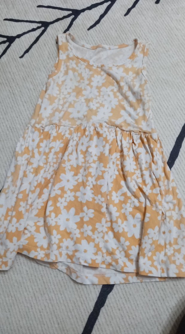 Kolsuz, beyaz çiçek desenli sarı tie-dye elbise, bol kesim, straplez yaka ve fırfır detaylı. Yumuşak sentetik kumaştan bohem tarzda.
