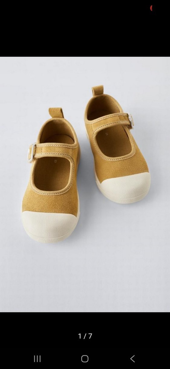 Kız çocuklar için açık sarı renkte, cırt cırtlı bant ve kauçuk burunlu sade babet ayakkabılar.