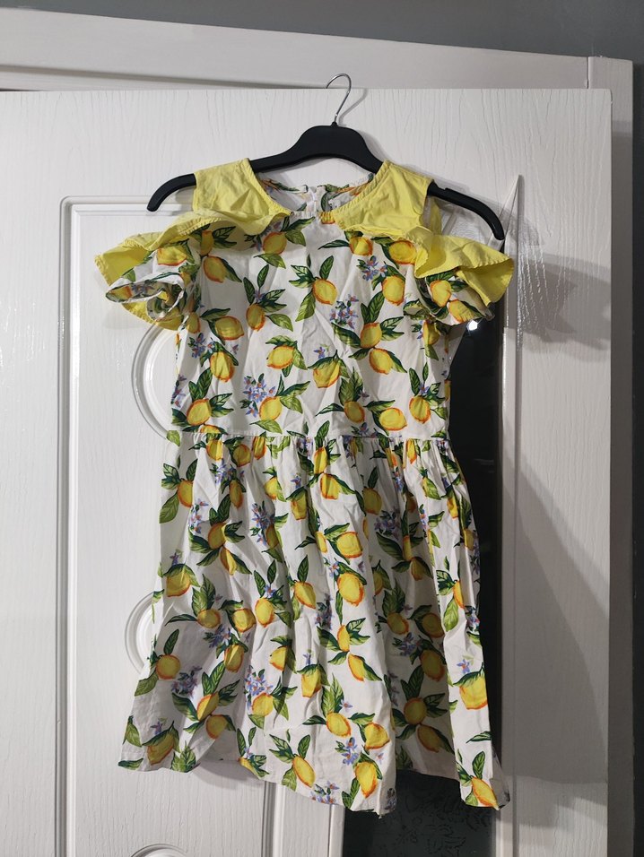 Renkli limon desenli, kısa kollu, fırfırlı ve yakalı, sentetik kumaştan yapılmış bol kesim kız çocuk elbisesi.