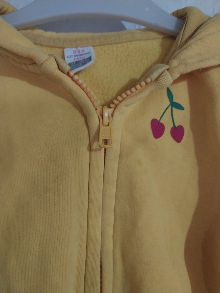 Fermuarlı ve kapüşonlu, yumuşak ve sıcak tüylü kumaştan yapılmış fitted kız çocuk sweatshirtü. Uzun kollu, pastel sarı renkte ve nakışlı kiraz detaylı, trend günlük stil için uygundur. önündeki lekeleri resimde belirttim