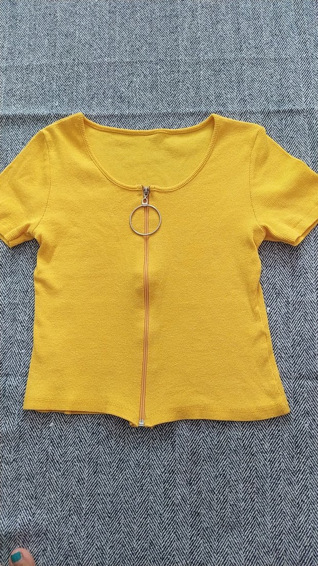 Kız çocukları için sarı, kısa kollu, bisiklet yaka ve fermuarlı, dar kesim örme kumaştan tişört. Trendy günlük stil için uygundur.