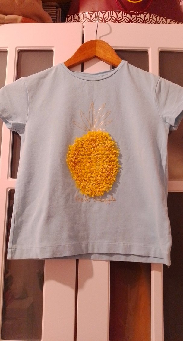 Kısa kollu, yuvarlak yakalı, bol kesim kız çocuk tişörtü. Pastel renkte, sarı fırfırlı ananas baskısı bulunur. pazarlığa açık