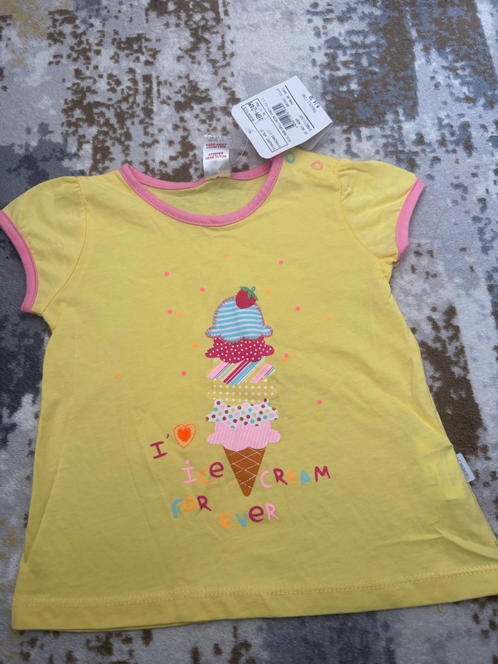 Sarı, pamuklu, kısa kollu ve bisiklet yakalı kız çocuk tişörtü. Önünde renkli dondurma baskısı ve fırfır detayları bulunur.