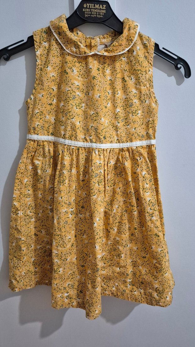 Kız çocukları için kolsuz, sarı renkli, bol kesim ve yakalı elbise. Bohem tarzda, fırfır detaylı ve hafif çiçek desenli.