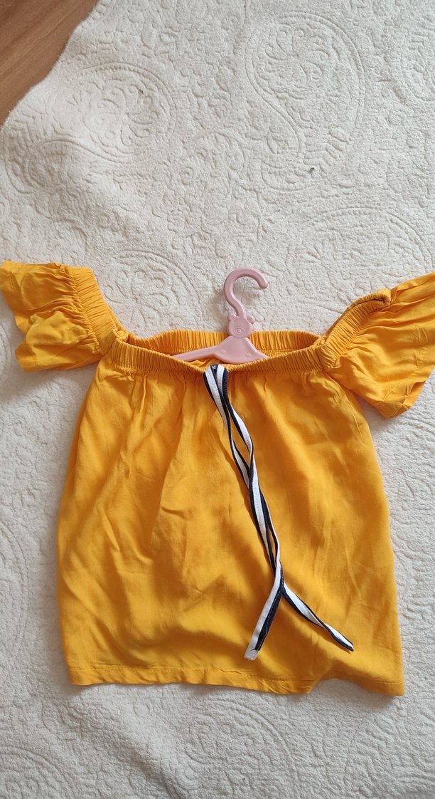 Sarı, fırfırlı, kayık yakalı, kolsuz, bol kesim kız çocuk bluzu, yumuşak sentetik kumaştan, bohem tarzı.