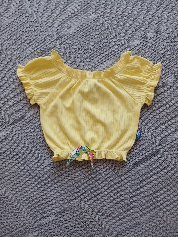 Kız çocukları için sarı renkte, kısa fırfırlı kollu, kayık yaka ve belde bağlama detaylı, bol kesim triko bluz.