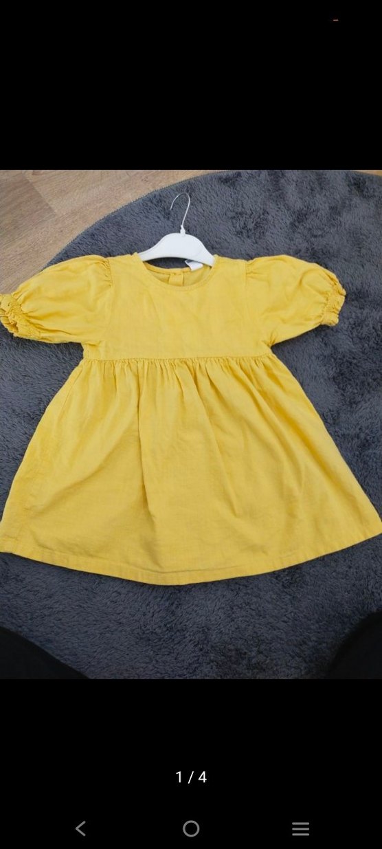 Renkli sarı elbise, kısa fırfırlı kol ve yuvarlak yaka detaylarıyla bol kesim, sentetik kumaştan üretilmiştir.