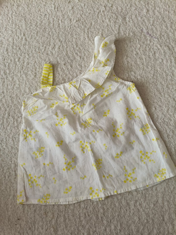 Yumuşak kumaştan, askısız yakalı ve fırfır detaylı bol kesim kız çocuk bluz. Pastel sarı işlemeli çiçek desenli, bohem tarzda.