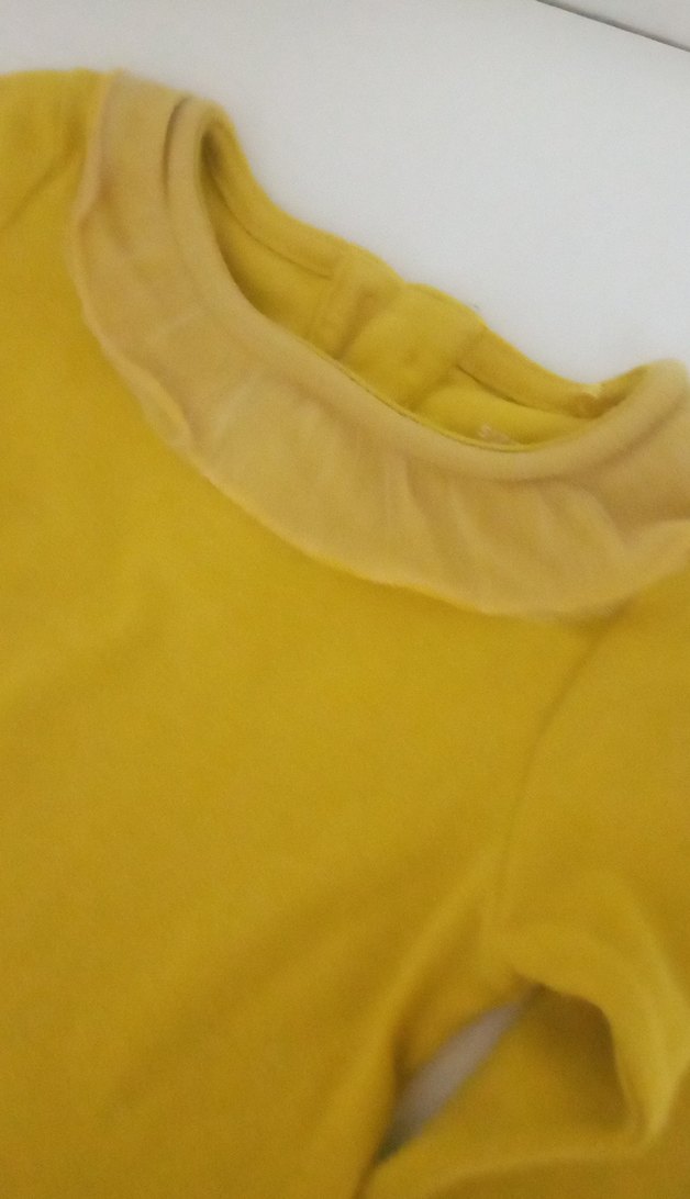 Sarı renkli kız çocuk sweatshirt, yuvarlak yaka ve fırfır detaylıdır. Uzun kollu, bol kesim ve yumuşak, sıcak kumaştandır.