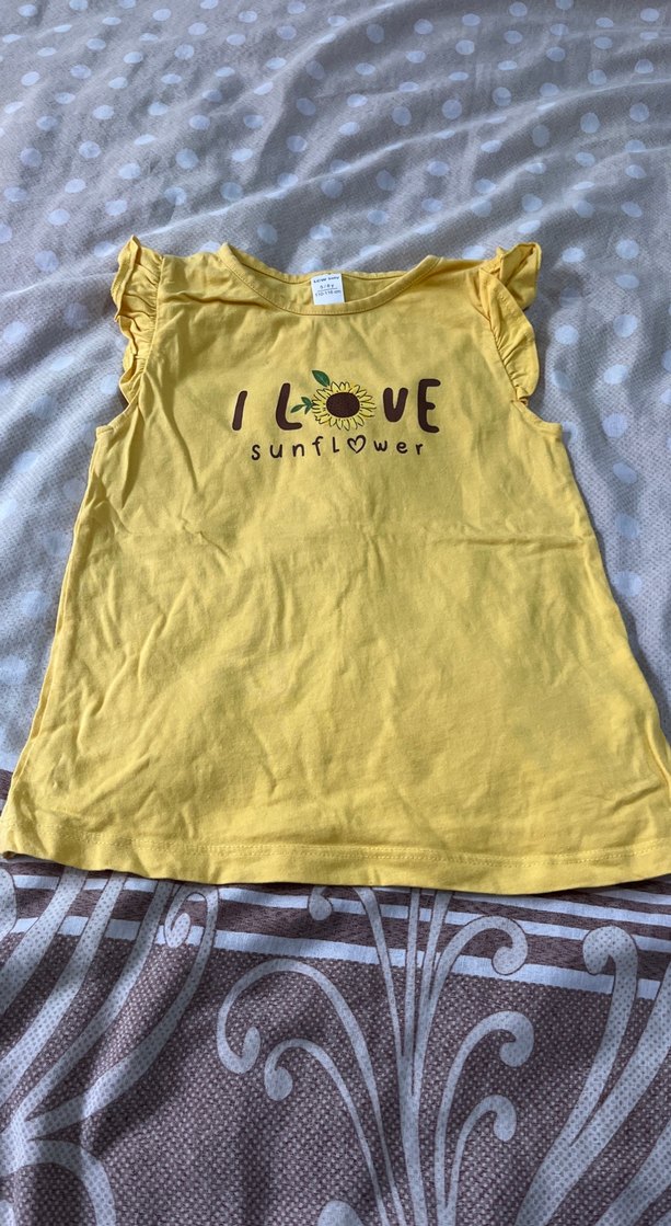 Sarı renkli kız çocuk tişörtü, kısa kollu ve fırfırlı detaylara sahiptir. Yumuşak keten kumaştan yapılmış, straplez yaka ve "I love sunflower" baskılı ayçiçeği deseni bulunur.
