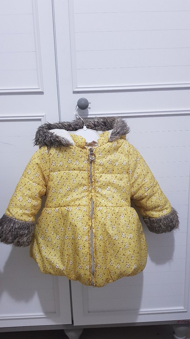 Kız çocukları için sarı, kapüşonlu ve kürk detaylı, baskılı desenli, yumuşak ve sıcak kumaştan yapılmış, dar kesim mont. sayılı kullanıldı tertemiz