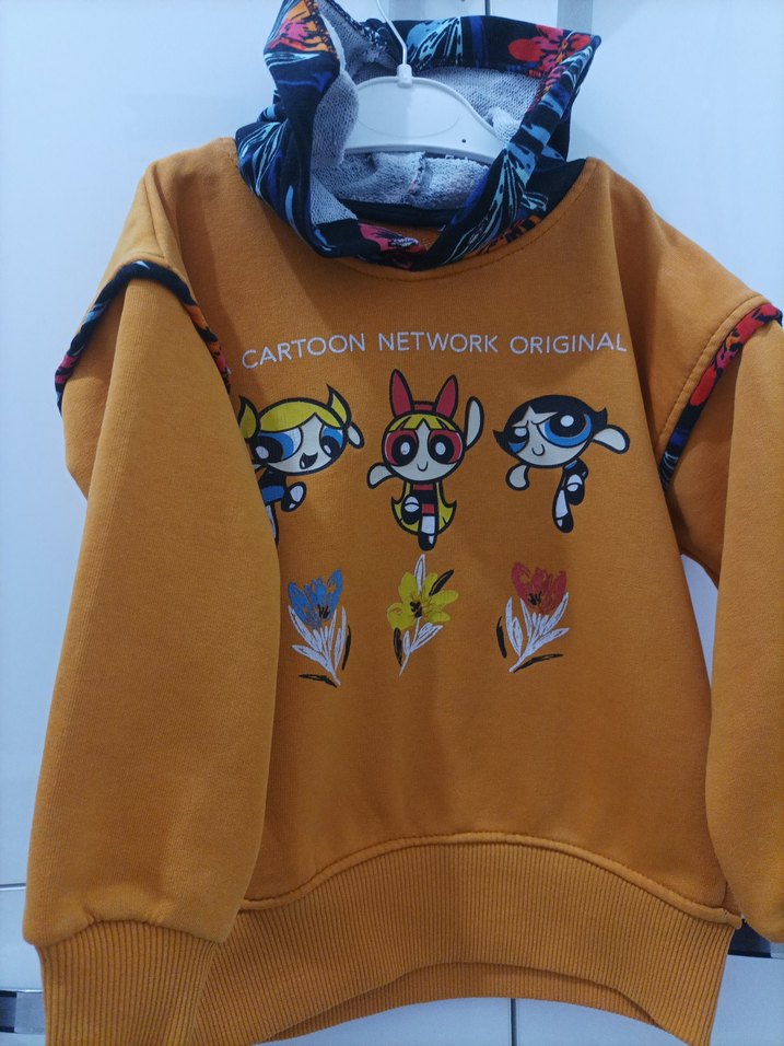 Sarı kapüşonlu kız çocuk sweatshirt, renkli baskılı ve uzun kollu. Gevşek kesim, örgü dokulu ve rahat bir yapıya sahip. Trendy casual tarz için uygun.