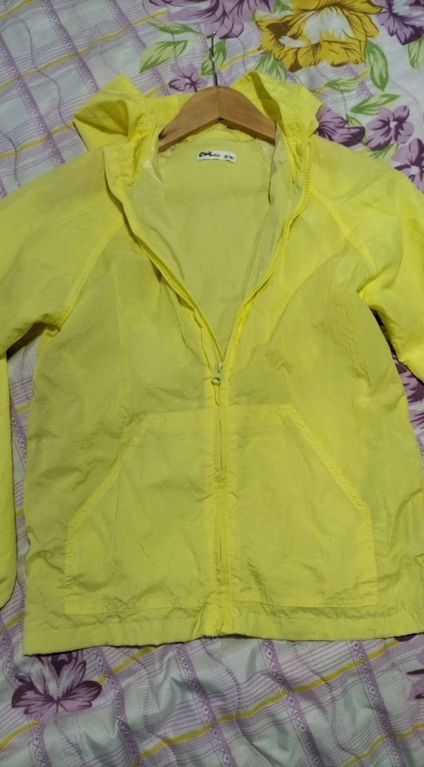 Sarı kapüşonlu kız çocuk yağmurluğu, fermuarlı ön ve bol kesimlidir, sentetik kumaştan üretilmiştir, sokak stili için uygundur. ️