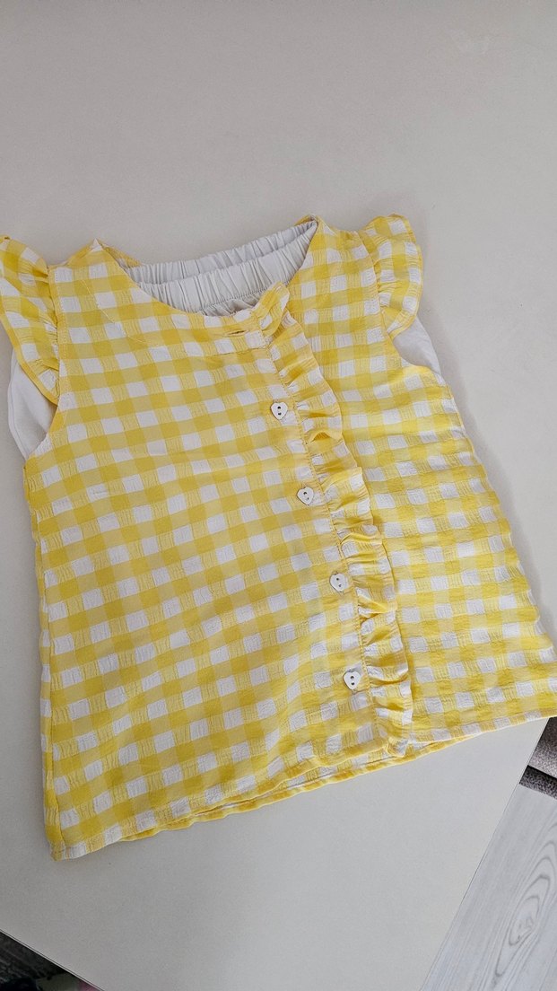 Sarı kareli pamuklu kumaştan, düğmeli, salaş kesim, kolsuz kız çocuk bluzu. Salaş ve rahat kesim, kayık yaka detaylı.