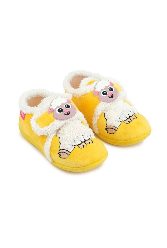 Kız çocukları için sarı keçe terlik, renkli nakışlı koyun figürüyle. Yumuşak keçe malzemeden ve kolay kullanım için cırt cırtlıdır.