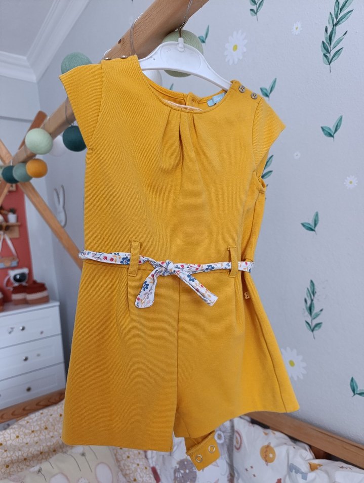 Sarı renkli, kemerli, kolsuz, bol kesim kız çocuk tulumu, sentetik kumaştan, streetwear tarzında.