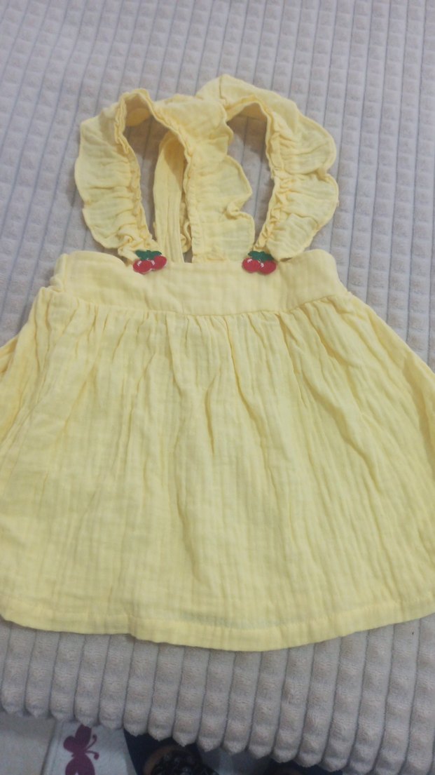 Yumuşak müslin kumaştan, bol kesim ve kolsuz sarı elbise. Fırfırlı askıları ve nakış detaylarıyla bohem tarzda. Rahat bir görünüm sağlar. bir iki kez giydirildi