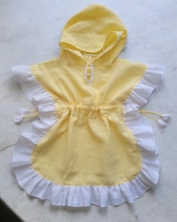 Sarı mudlin kumaştan, fırfırlı ve bol kesim kız çocuk ponçosu. Bohem tarz için uygundur.