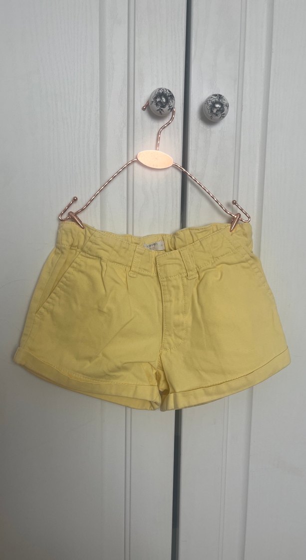 Kemerli, bol kesim sarı keten kız çocuk şortu, sade ve sokak tarzına uygun.