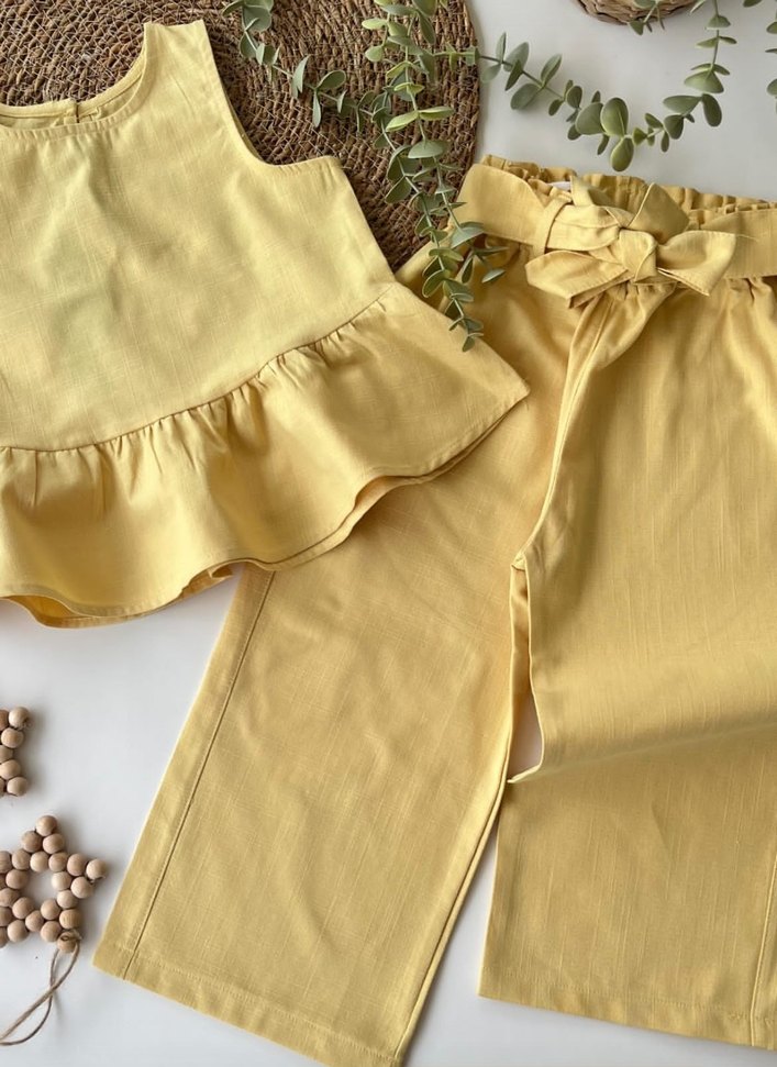 Kız çocukları için sarı renkte, bol kesim, ipeksi dokulu, belinde fırfır detaylı bohem tarzda pantolon. %100 keten kumaş harıka tasarım tek beden 3/4 yaş tam kalıp tır.