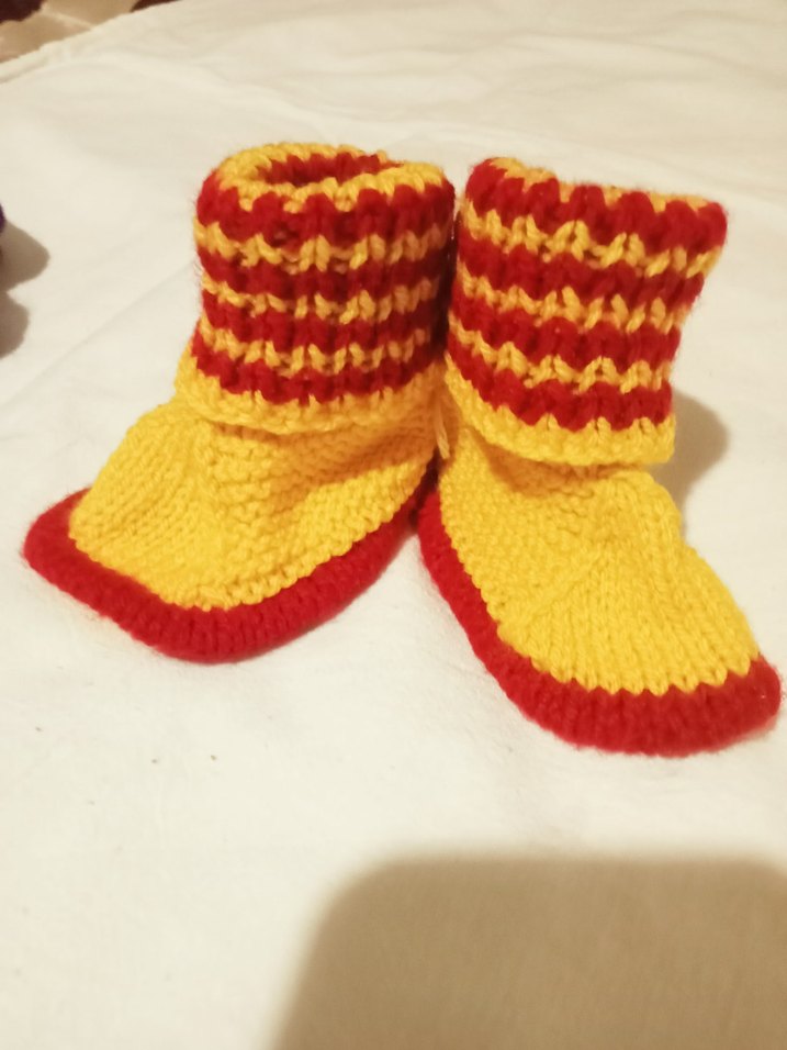Sarı ve kırmızı renklerde örgüden yapılmış, sade ve renkli kız çocuk patikleri, yumuşak örme kumaştan üretilmiştir.