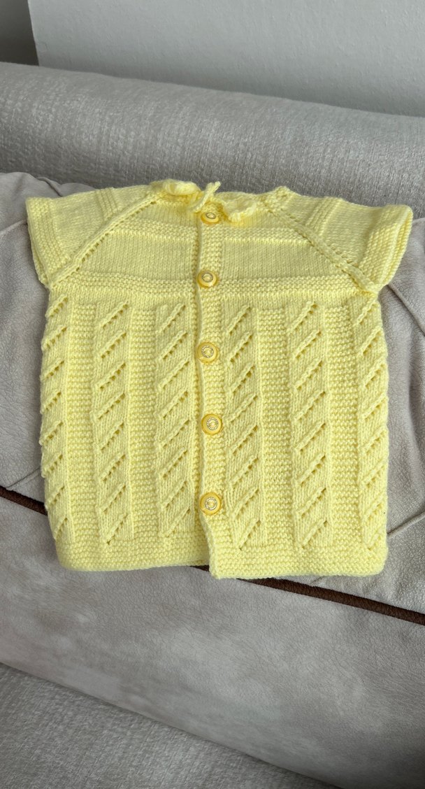 Sarı renk ister kız ister erkek bebek için el örgüsü yelek. Kullanılmamıştır.