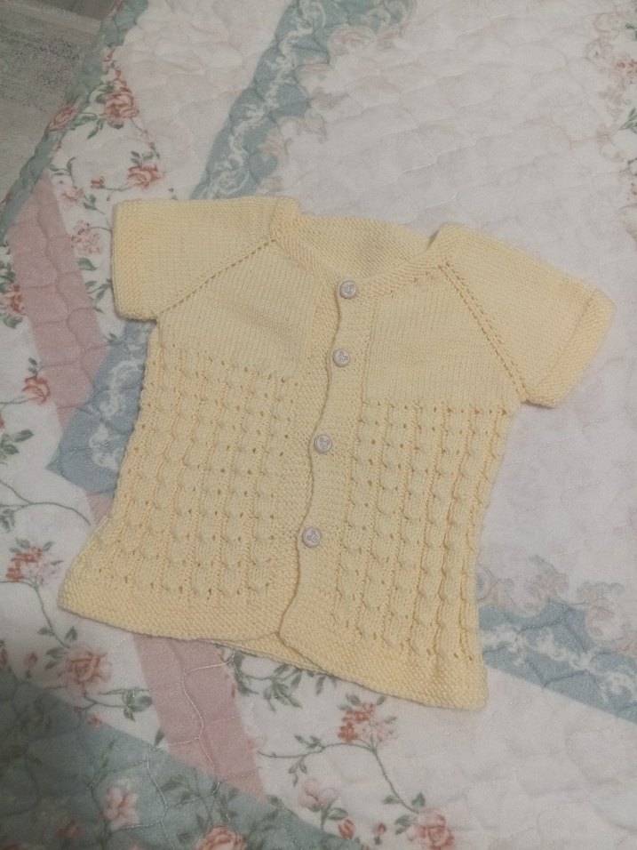 Kız çocukları için kısa kollu, düğmeli ve ince örme dokulu sarı hırka. Pastel tonuyla yumuşak bir görünüm sunar.