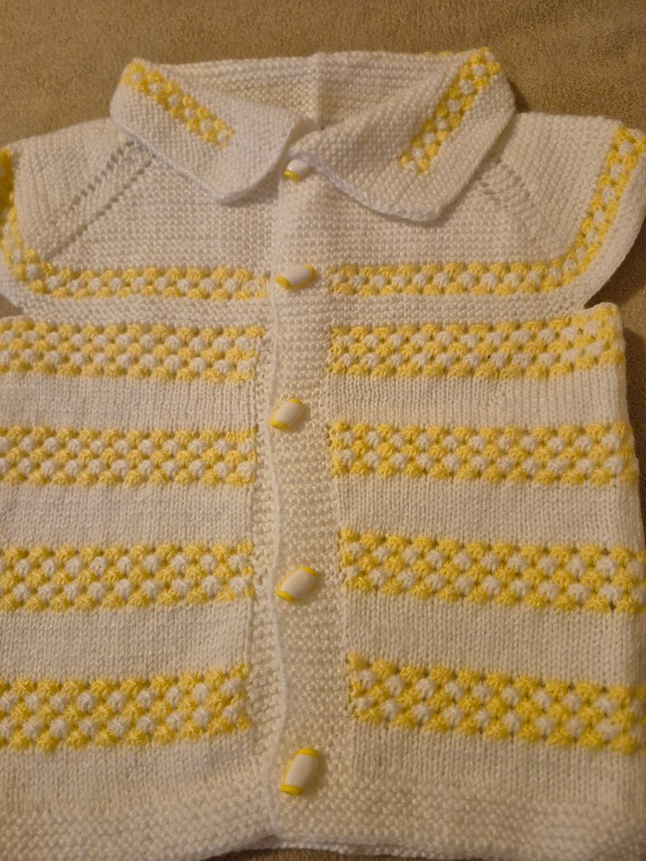 Kız çocukları için açık sarı renkte, kısa kollu, düğmeli ve yakalı örgü hırka. Rahat kesime sahip klasik tarzda.