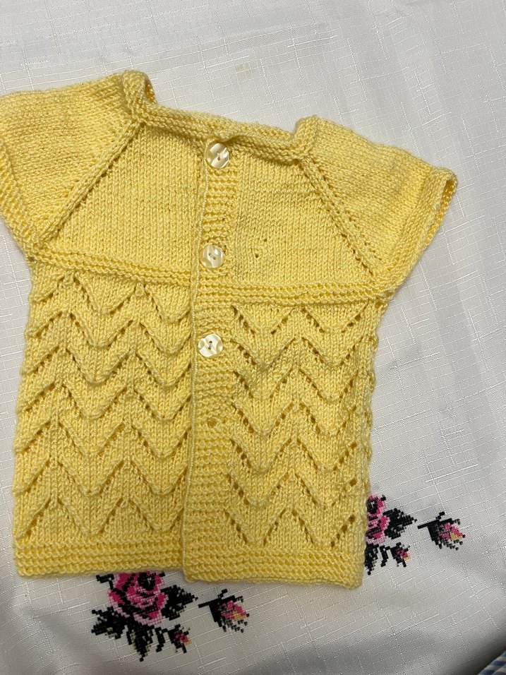 Vintage tarzı, sarı renkli, kısa kollu örgü kız çocuk hırkası. Düğmeli ve vücuda oturan kesimi ile dikkat çeker.