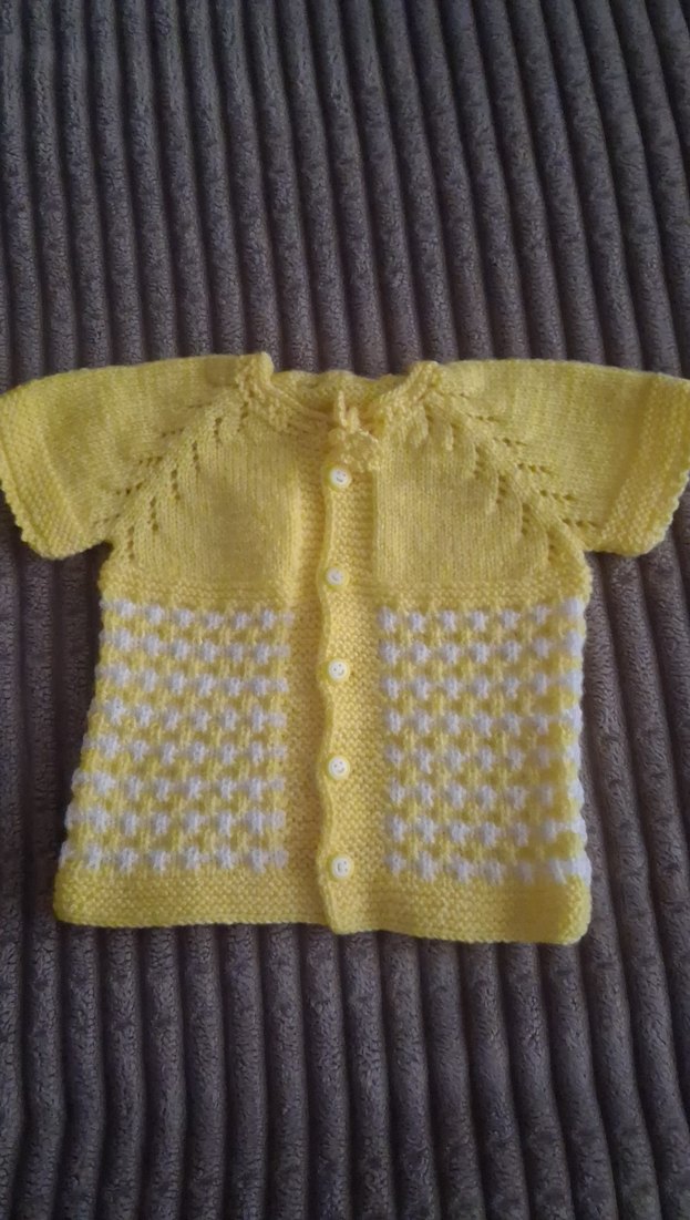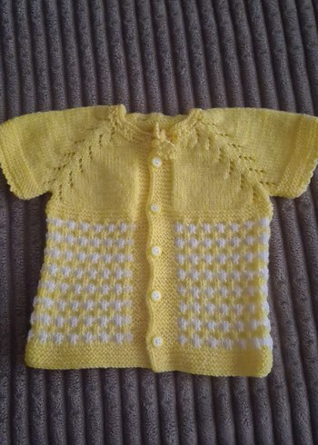 Kısa kollu, fitted sarı renkli kız çocuk örgü hırka. Alt kısmında hafif kare desen bulunur, klasik tarzda düğmeli önü vardır.el örgüsüdür ,sıfır ürün