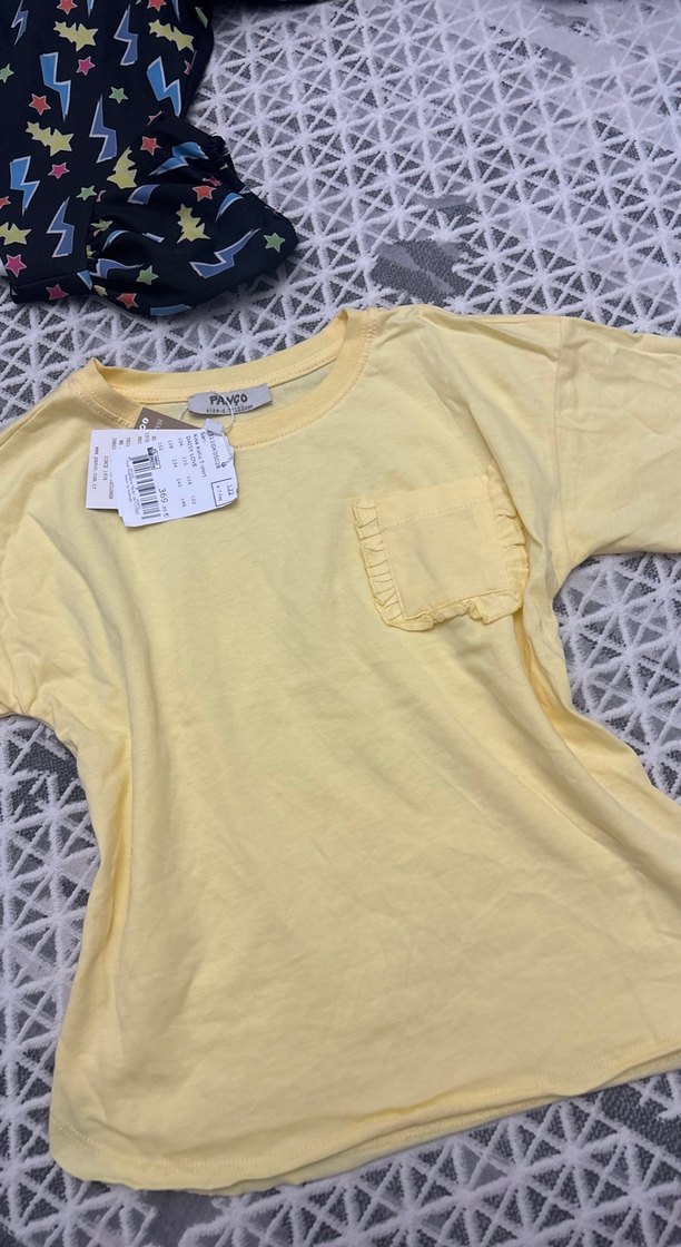 Yumuşak keten kumaştan, salaş kesim sarı kız çocuk tişörtü. Kısa kollu ve yuvarlak yaka, göğüs cebinde fırfır detayı bulunur.