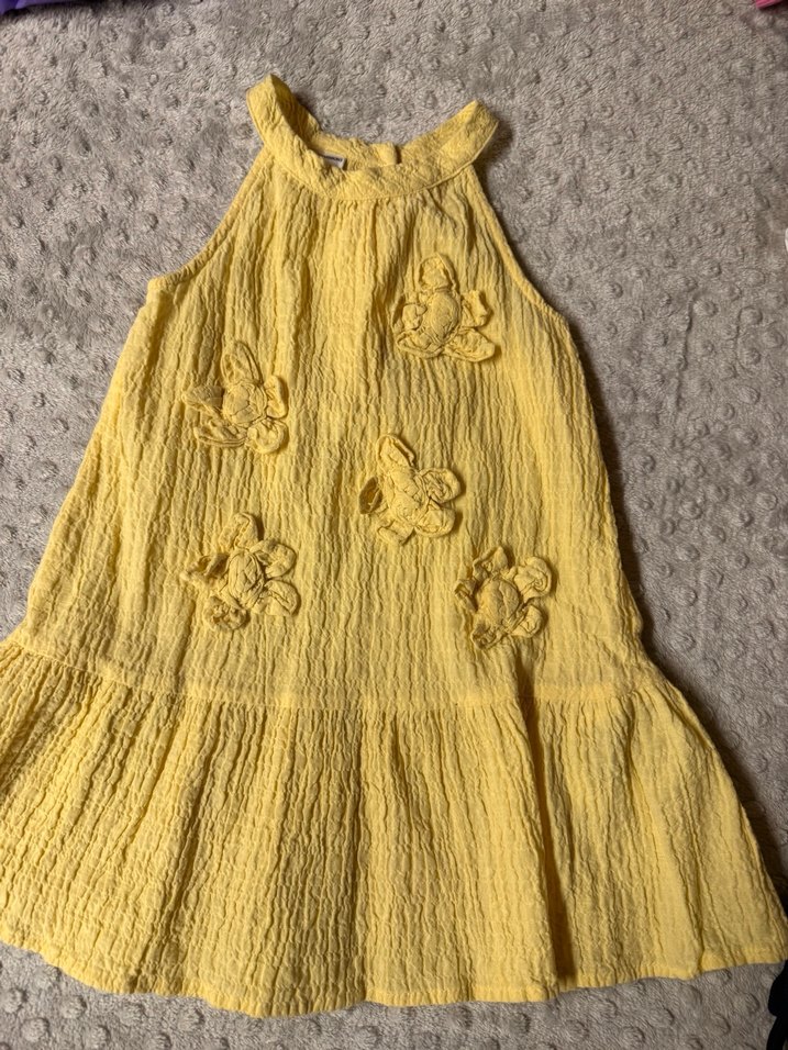 Yumuşak keten kumaştan, çiçek detaylı, kolsuz ve bol kesim kız çocuk elbisesi, uç kısmı fırfırlı, pastel sarı renkte.