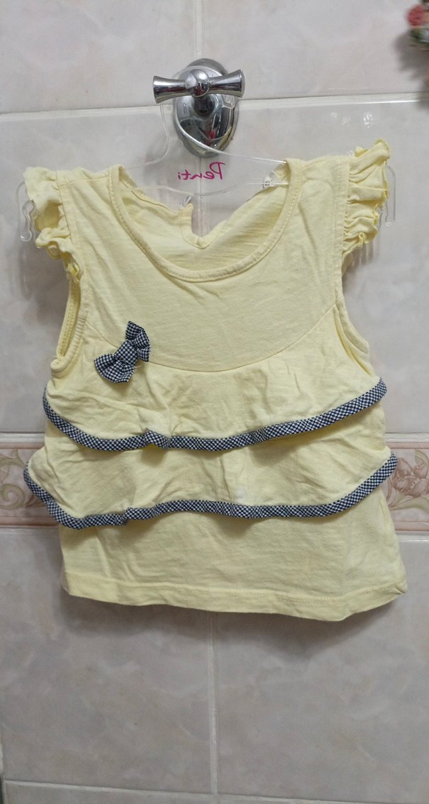 Kız çocuklar için sarı, kolsuz, fırfır detaylı, vücuda oturan yuvarlak yakalı elbise. Yumuşak sentetik kumaştan, ekose detaylı sade ve hafif tasarım, günlük kullanıma uygun.