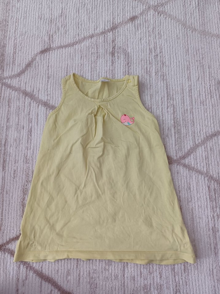 Yumuşak kumaştan, pastel sarı renkli, bisiklet yakalı, kolsuz ve bol kesim kız çocuk.tisory . Küçük pembe balina motifi bulunur.