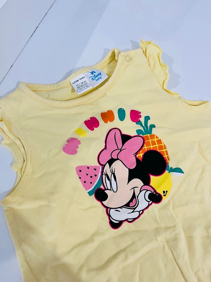 Pamuklu sarı tulum , Minnie baskısı ve meyve desenleriyle. Fırfırlı kolsuz kol ve bisiklet yaka, trend rahat stil sunar.
