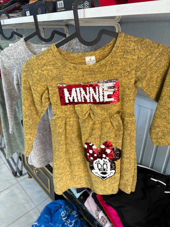 Uzun kollu, fitted kesim kız çocuk triko kazak. Önü Minnie baskılı ve payet detaylıdır. Sokak stili, sarı ve gri tonlarında.