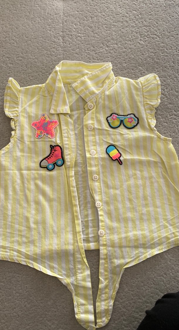 Sarı renkli, nakışlı ve düğmeli kız çocuk gömleği, askısız yakalı ve bol kesimdir. Trend sokak stiline uygundur.
