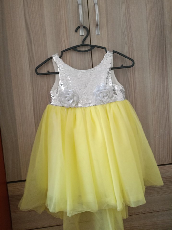 Kız çocuk elbisesi, payetli işlemeli üst ve sarı fırfırlı etek ile tasarlanmıştır. Kolsuz ve straplez modeldir.
