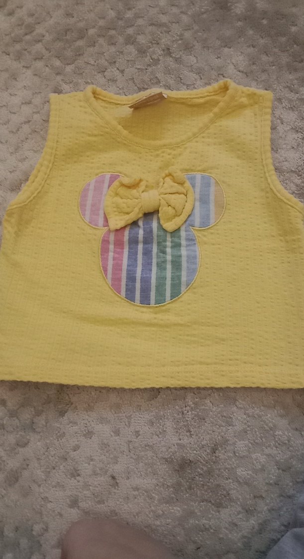 Kız çocukları için kolyessiz, yuvarlak yakalı, bol kesim sarı örgü süveter. Nakışlı pastel çizgili fare deseni ve fırfırlı fiyonk detayı içerir.
