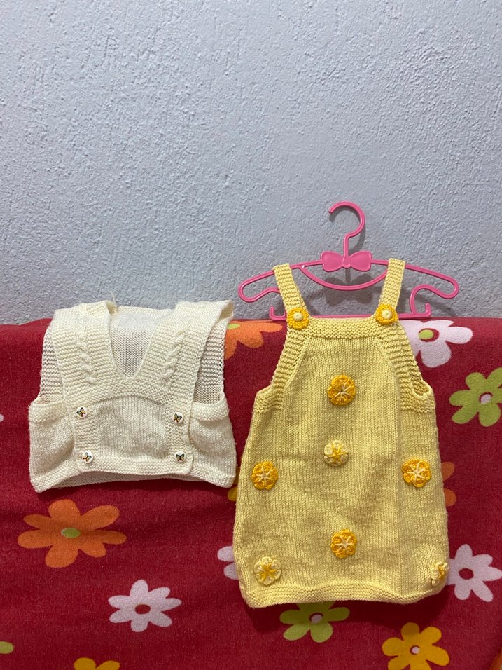 Fitted kesim, kolsuz sarı triko elbise, renkli nakış detaylarıyla bohem tarz sunar.
