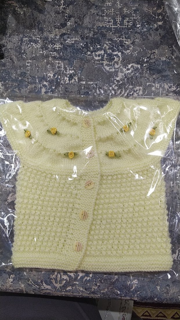 Pastel sarı renkli, yumuşak örgü kumaştan yapılmış kız çocuk kolsuz hırka. Nakışlı çiçek detayları ve ahşap düğmelerle klasik bir tasarım sunar.