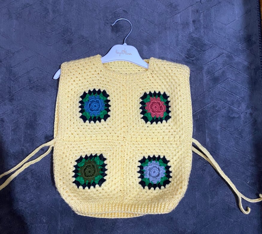 Kolsuz, yuvarlak yaka kız çocuk yeleği, gevşek kesim ve örgü kumaştan yapılmıştır. Hafif çok renkli nakışlı bohem tarzındadır.