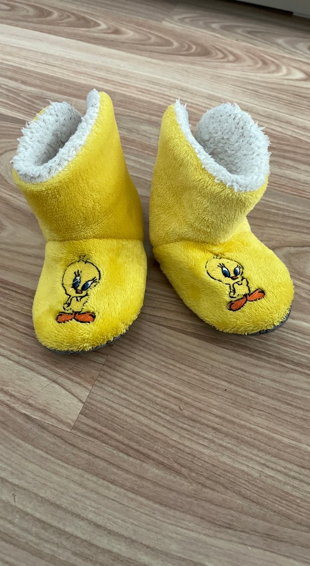 Renkli sarı, nakışlı pop kültür desenli kız çocuk ev terliği, yumuşak ve sıcak iç yüzeyiyle rahatlık sağlar.