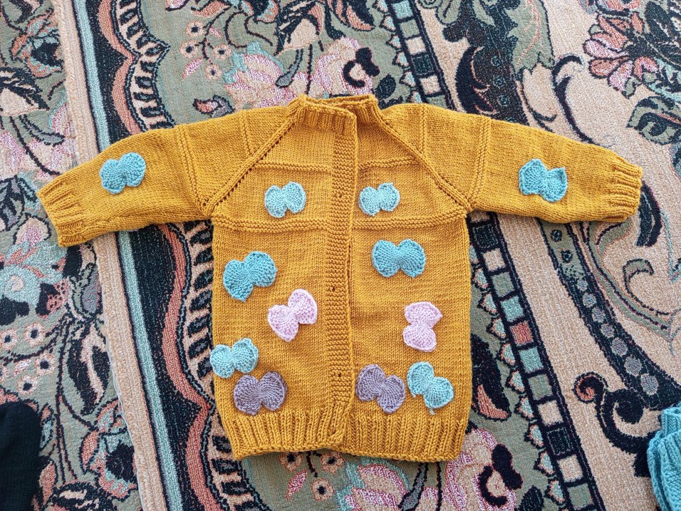 Fitted kesim, sarı örgü kız çocuk hırka, uzun kollu ve pastel renkli fiyonk uygulamalarıyla bohem tarzda.