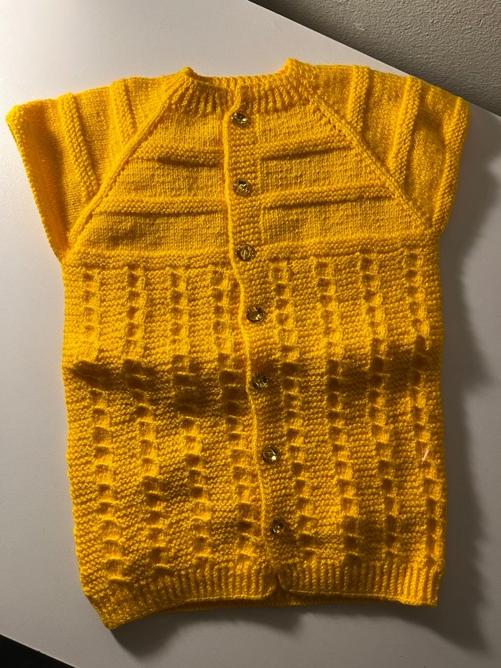 Kız çocukları için örme kumaştan yapılmış kolsuz, fitted bohem tarzda sarı renkli hırka. Düğmeli kapanışa sahiptir.