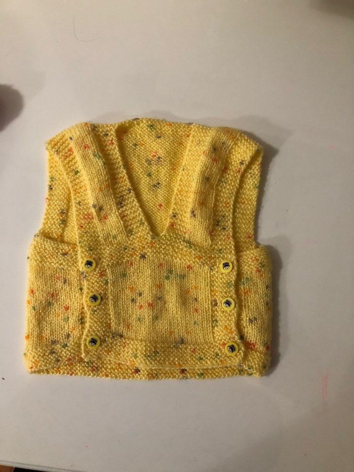 Kız çocukları için sarı renkli, örgü ve kolsuz süveter. V yakalı, dar kesim ve renkli benekli desene sahiptir. Önde düğme detayları bulunur.