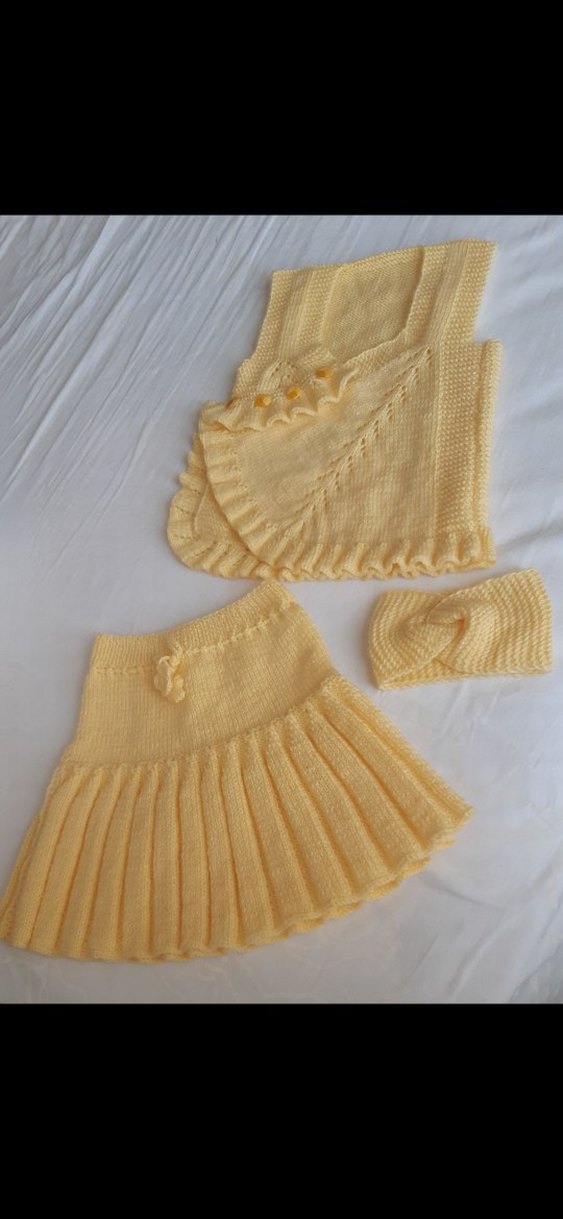 Yumuşak örgüden yapılmış, sarı renkli, kolsuz ve vücuda oturan üst, pileli etek ve uyumlu saç bandından oluşan kız çocuk takımı.