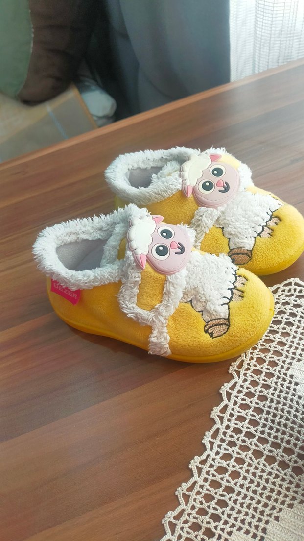 Nakışlı koyun deseni ve yumuşak kürk detaylı renkli sarı kız çocuk terliği, rahat ve bohem tarz sunar.